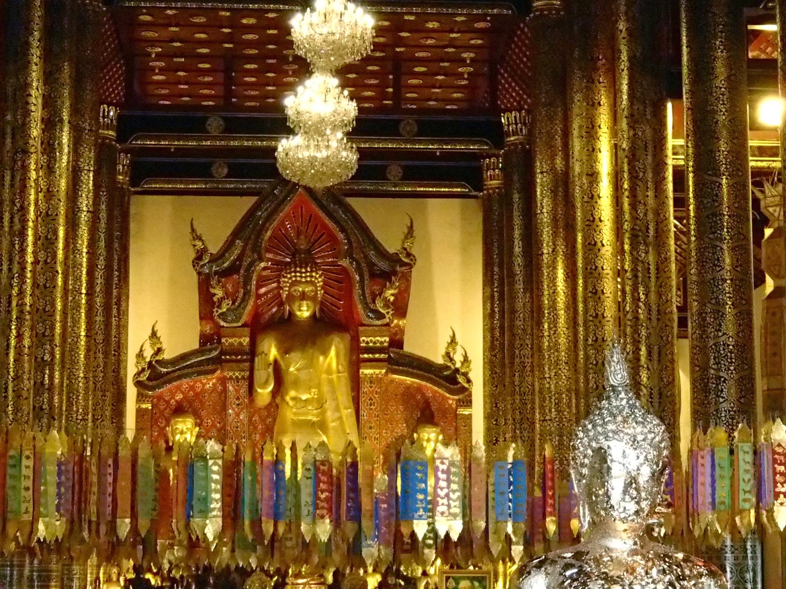 It’s got a big grand entrance with a gold statue out front too, so you know it’s the right place. The inside of the wat was cool. They ran wires across the hall and had these banners hanging about 8 feet off the ground making a faux ceiling when you were under them (effectively hiding buddha from view when you’re under them, but making an otherwise big space a little more intimate). I don’t know if it’s always like this or if this is for the holiday, but it looked cool.